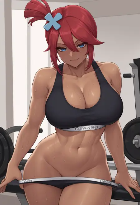 デフォルトの衣装: dark-skinned female, sidelocks, hair between eyes, one side up, hair ornament, blue eyes, blue jacket, cropped jacket, turtleneck jacket, long sleeves, blue gloves, blue shorts, short shorts, thigh strap, thigh pouch, blue footwear, boots, stomach, navel