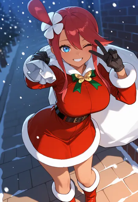 2020年ホリデー: dark-skinned female, sidelocks, one side up, hair ornament, blue eyes, santa costume, red dress, santa dress, fur-trimmed dress, long sleeves, black gloves, black belt, red footwear, santa boots
