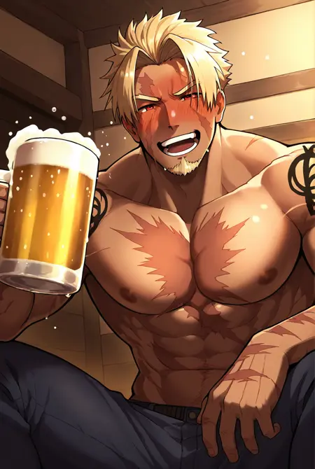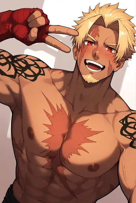 触发词: beowulf fgo, 无上装男性, 疤痕, 纹身, 金发, 面部毛发, 山羊胡, 红眼, 胸部疤痕, 深色皮肤