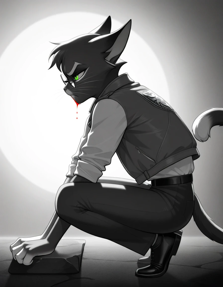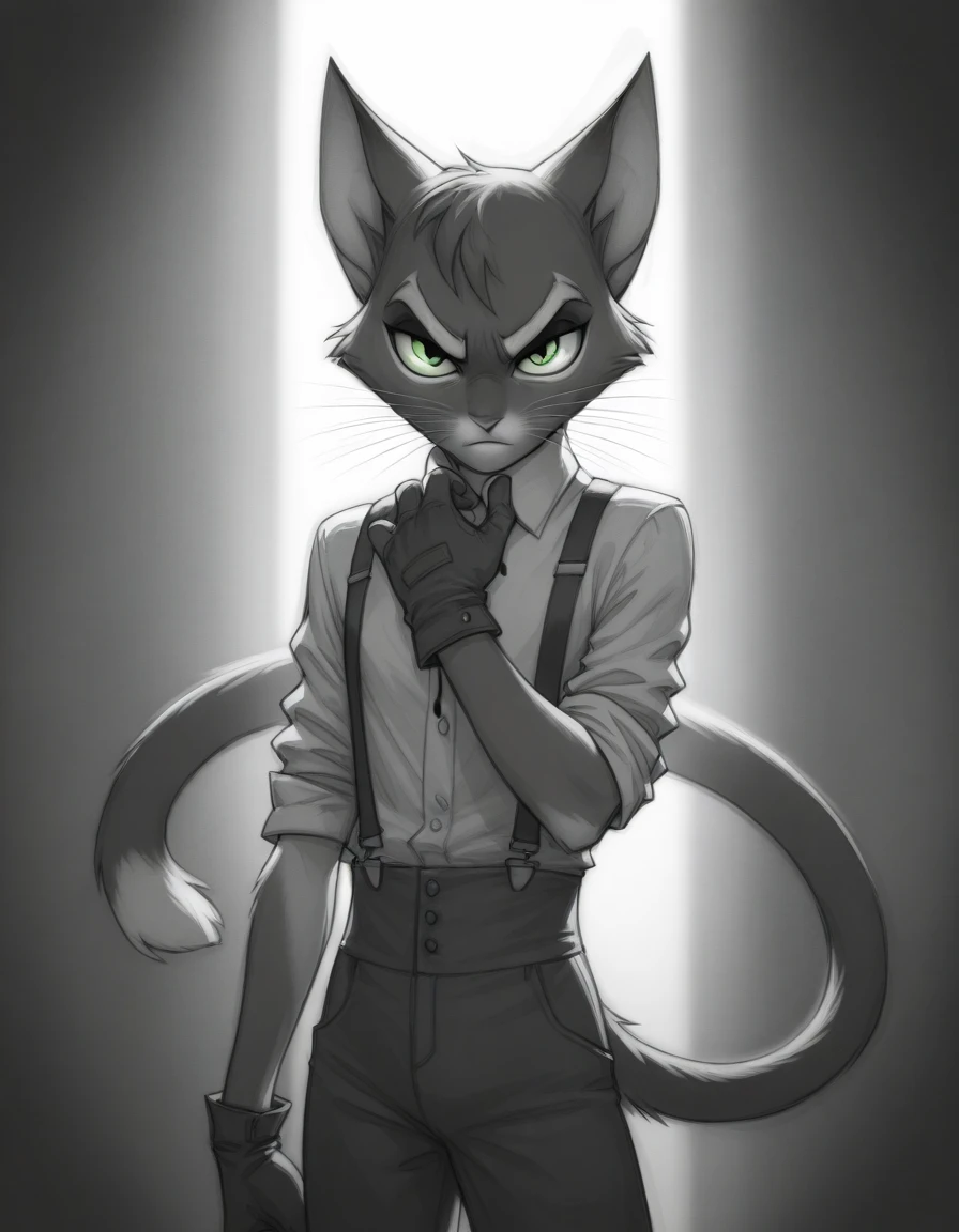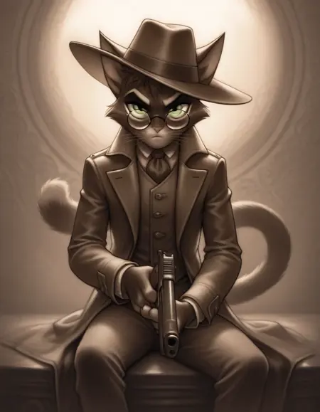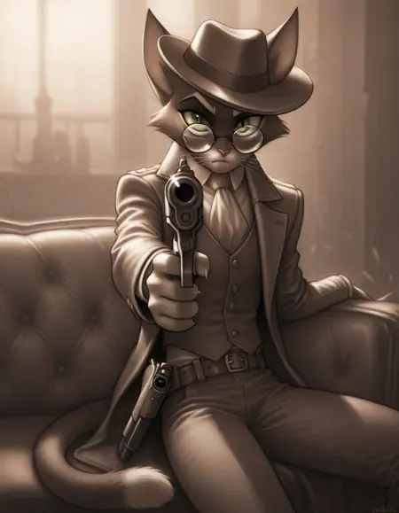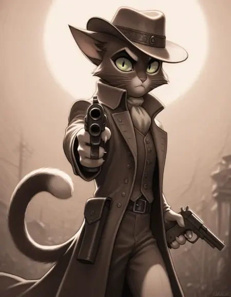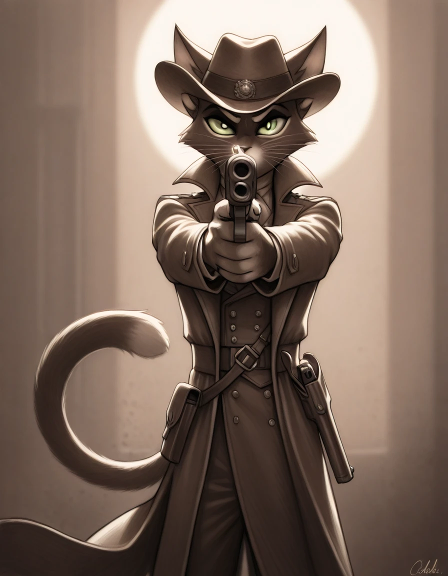 sepia, monochrome, greyscale, sketch, blood, cat, whiskers, sleeves rolled up, suspenders, gloves, hat, gun, holding gun