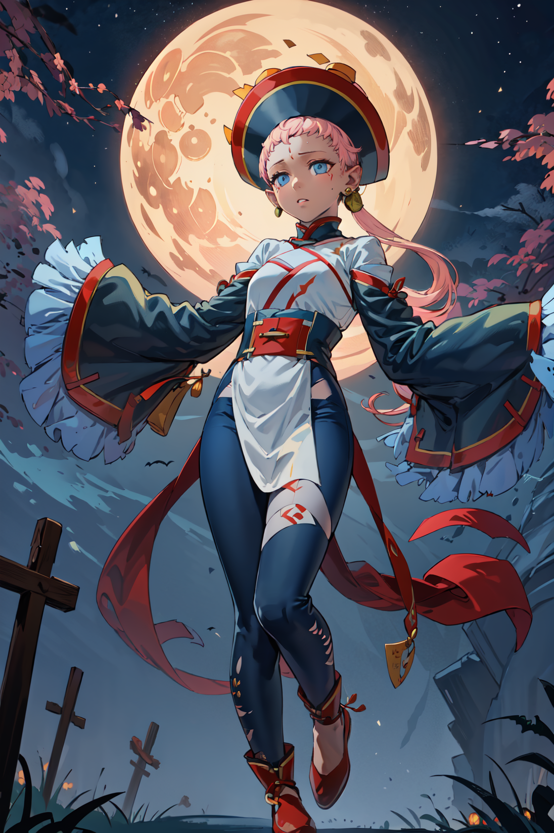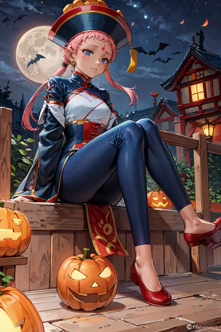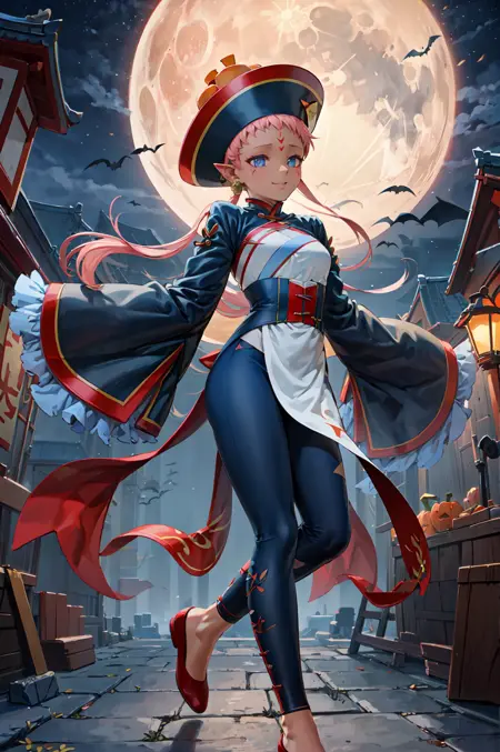 【ハロウィン衣装プロンプト】: hal_ena, 清官帽, 広い袖, ジュエリー, 帽子, ピアス, 腰のカーテン, お札, 長袖, 赤い靴, 青いズボン, 袖が指先より長い