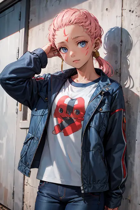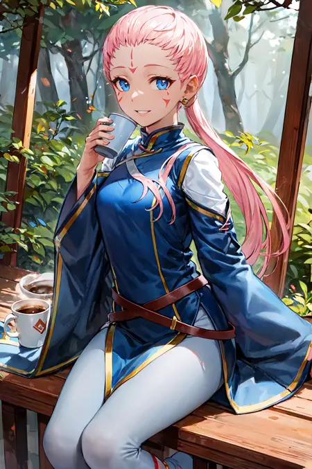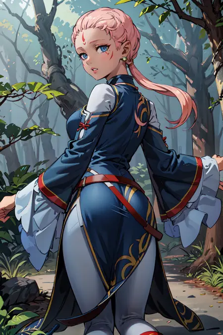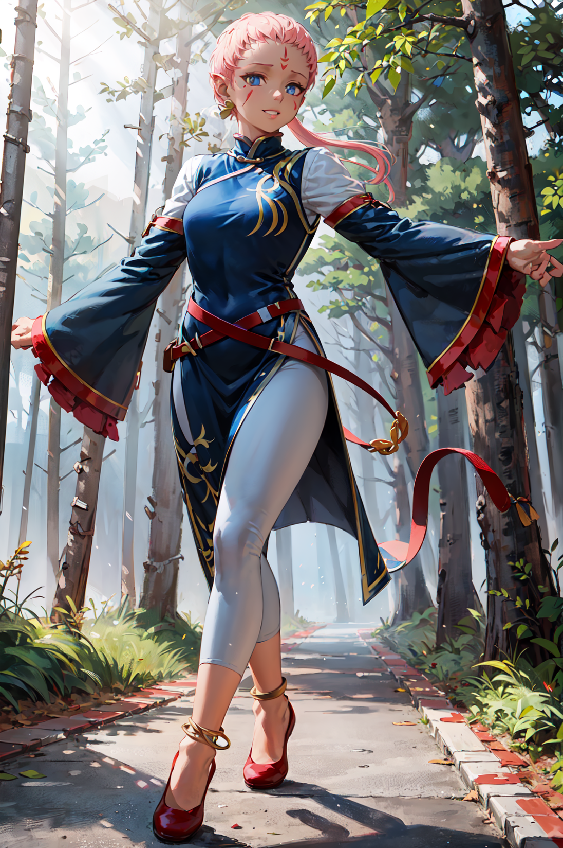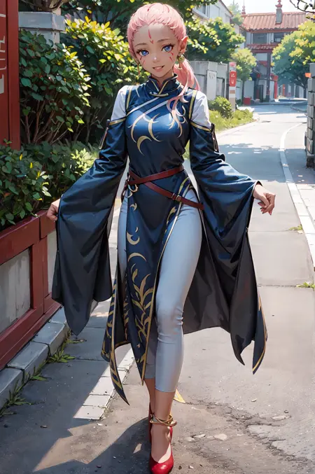 【デフォルト衣装プロンプト】: def_ena, ドレス, ジュエリー, ピアス, 長袖, 額のマーク, 赤い靴, 白いズボン, アンクレット, 広い袖, ベルト, 中国風の服