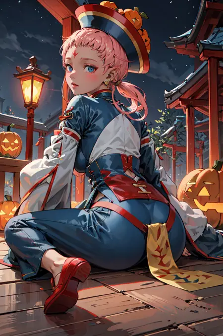 【万圣节服装提示】:hal_ena,清官帽,宽袖,珠宝,帽子,耳环,腰帷,御符,长袖,红色鞋子,蓝色长裤,袖子超过手指
