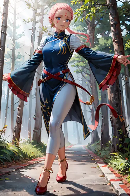 【默认服装提示】:def_ena,连衣裙,珠宝,耳环,长袖,额头标记,红色鞋子,白色长裤,脚链,宽袖,腰带,中式服装