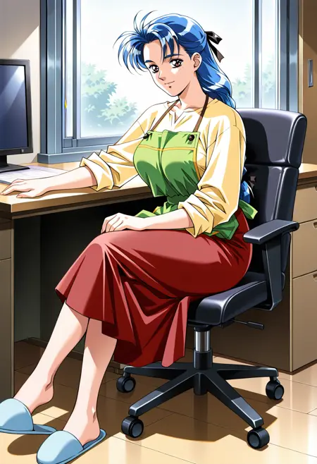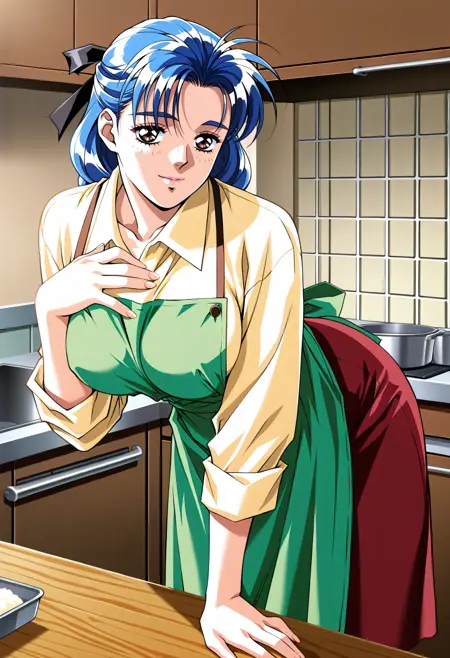 Base: n_misako, 1girl, retro artstyle, solo, low-tied long hair, blue hair, parted bangs, single braid, hair ribbon, black ribbon, brown eyes, makeup, mature female, yellow shirt, misako green apron, collared shirt, long sleeves, sleeves rolled up, red skirt, large breasts,