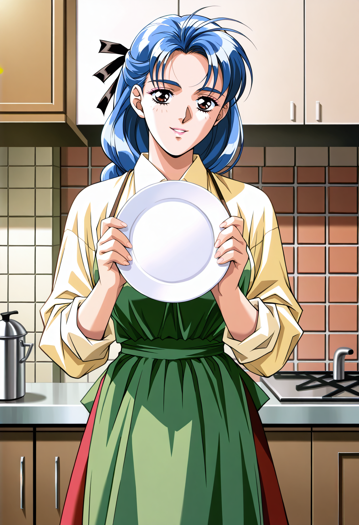 基础:n_misako, 1girl, 复古艺术风格, 单人, 低扎长发, 蓝发, 分开刘海, 单条辫子, 发带, 黑色发带, 棕色眼睛, 妆容, 成熟女性, 黄色衬衫, Misako 绿色围裙, 有领衬衫, 长袖, 袖子卷起, 红色裙子, 大胸
