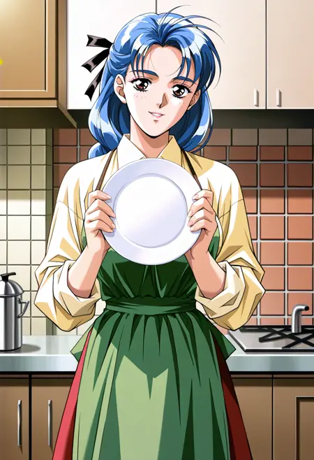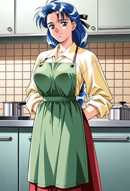 Base: n_misako, 1girl, retro artstyle, solo, low-tied long hair, blue hair, parted bangs, single braid, hair ribbon, black ribbon, brown eyes, makeup, mature female, yellow shirt, misako green apron, collared shirt, long sleeves, sleeves rolled up, red skirt, large breasts,