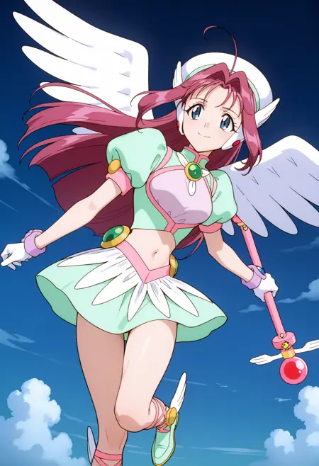 마법의 소녀, 모자, 크롭 탑, 풍성한 short sleeves, 보석, 브로치, 천사 날개, 배꼽, 복부, 흰 장갑, 녹색 치마, 발목 끈신, 날개 달린 신발