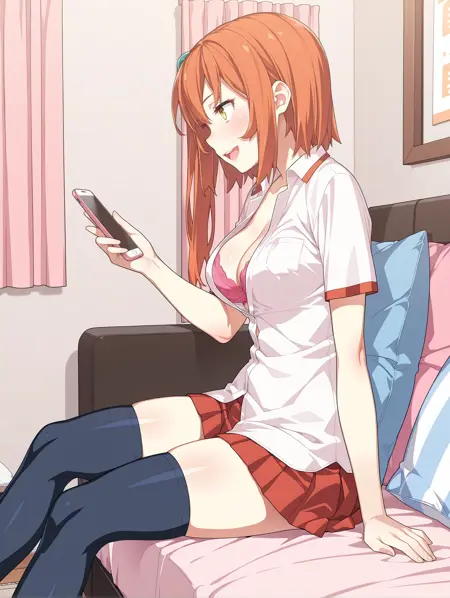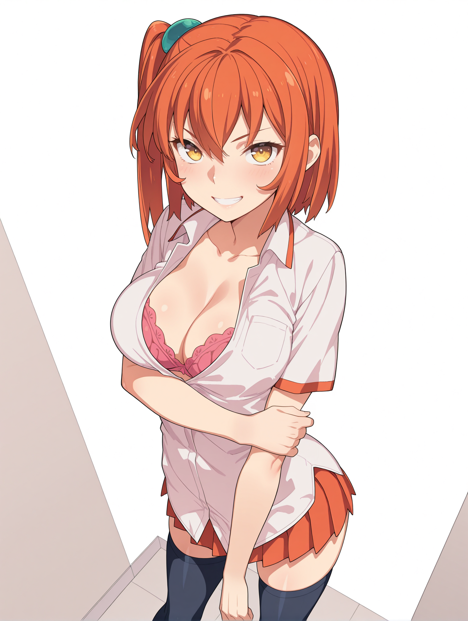 의상 단어: y_clothes, 열린 셔츠, 브라, 가슴선, 빨간 치마, 속옷, 젯타이 러이키, 검은 허벅지 양말