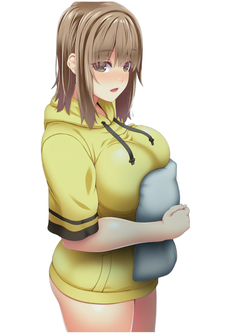 의상: 노란 후디, 짧은 소매, 바지 없음, 다리 노출,