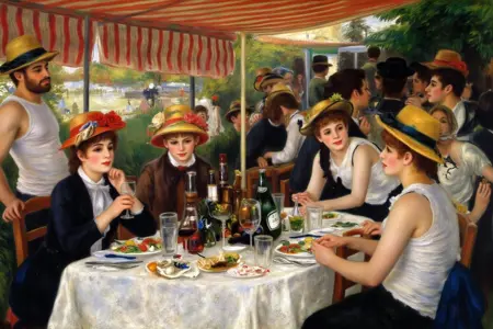 르노아르는 여가를 사치가 아니라, 축하할 가치가 있는 현대 생활의 핵심 요소로 보았습니다. 그는 거대한 역사적 혹은 종교적 주제가 아닌, 춤추고, 식사하고, 보트를 타고, 산책하는 기쁨과 연결의 순간들을 그렸습니다.