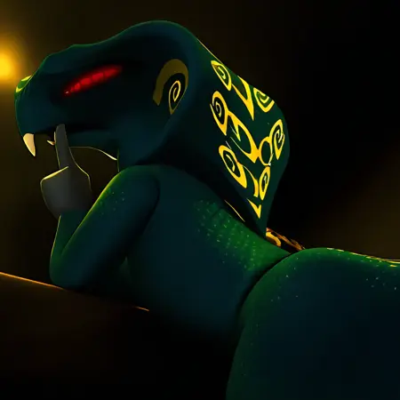 Tags: Skales, Hypnobrai, serpentine, snake, small mouth, cobra hood, yellow spirals on hood, teal scales, white yellow light grey and black body markings, head markings, body markings, long tail, very long tail, tail markings, no legs, apode, grey hands, fangs, red glowing eyes, dark red pupils, spirals in eyes, dark eye liner, pointed teeth, 2 fangs, short neck