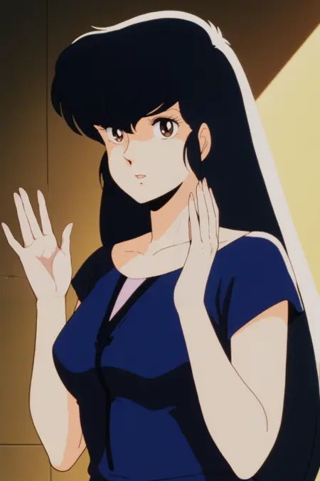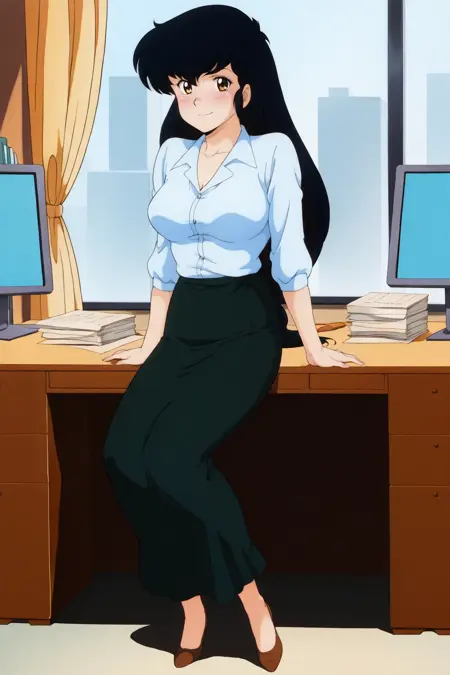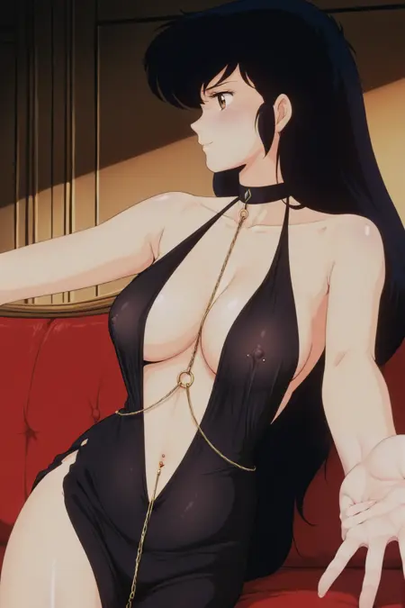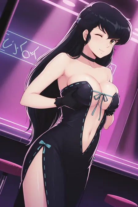 Main Tag: Sakura, long black hair, sidelocks, brown eyes, makeup, medium breasts, retro artstyle, 1980s (style)