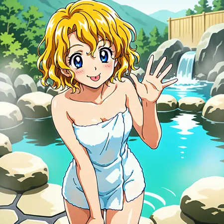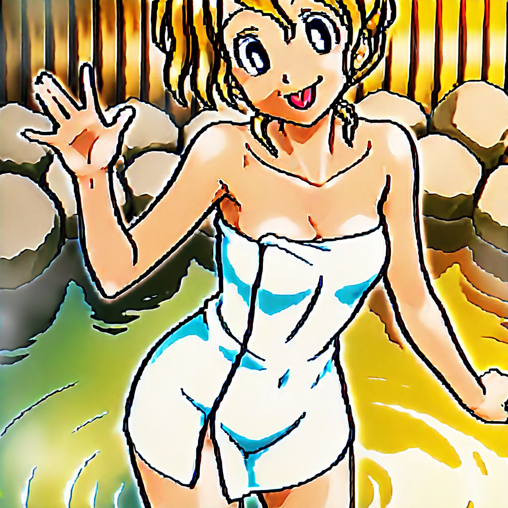 注:屋外の風景は学習に含まれていないため、温泉の水場や背景のような要素は生成されません。