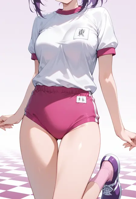 トリガーワード: ジムユニフォーム、短袖、ピンクのブルマ、紫の靴、ピンクの靴下、