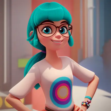 cyan hair, ponytail, glasses, blue eyes, white graphic tee, bracelets, tassel rope belt, blue shorts, pink leggings, striped socks, pink sneakers