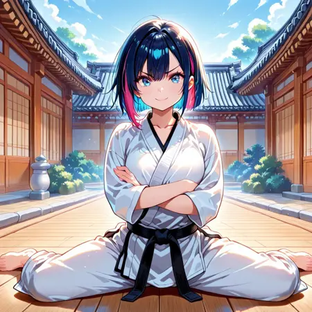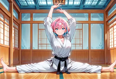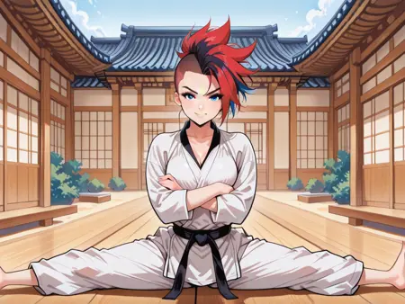 大师级作品,最佳质量,惊人的质量,((劈叉姿势)),((抬高劈叉)),盒子,1个女孩,单人,赤脚,长发,((在地面以上)),道场,橙色头发,蓝色眼睛,微笑,看着观众,