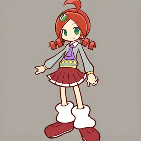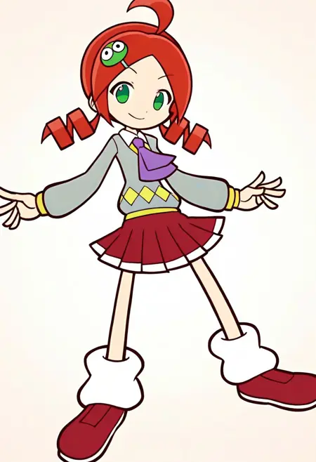 | 训练词汇 | PuyoPuyoRingoAndo, 1girl, character hair, ornament hair ornament, ahoge, red hair, twintails, drill hair, hairclip, twin drills, short hair, short twintails, green eyes,已复制! skirt, pleated skirt, red skirt, 已复制! sweater, gray sweater, long sleeves, socks, loose socks, shoes,已复制! yellow sweater, sweater vest, short sleeves, white shirt, collared shirt, zettai ryouiki, thighhighs, blue thighhighs, boots,已复制! |