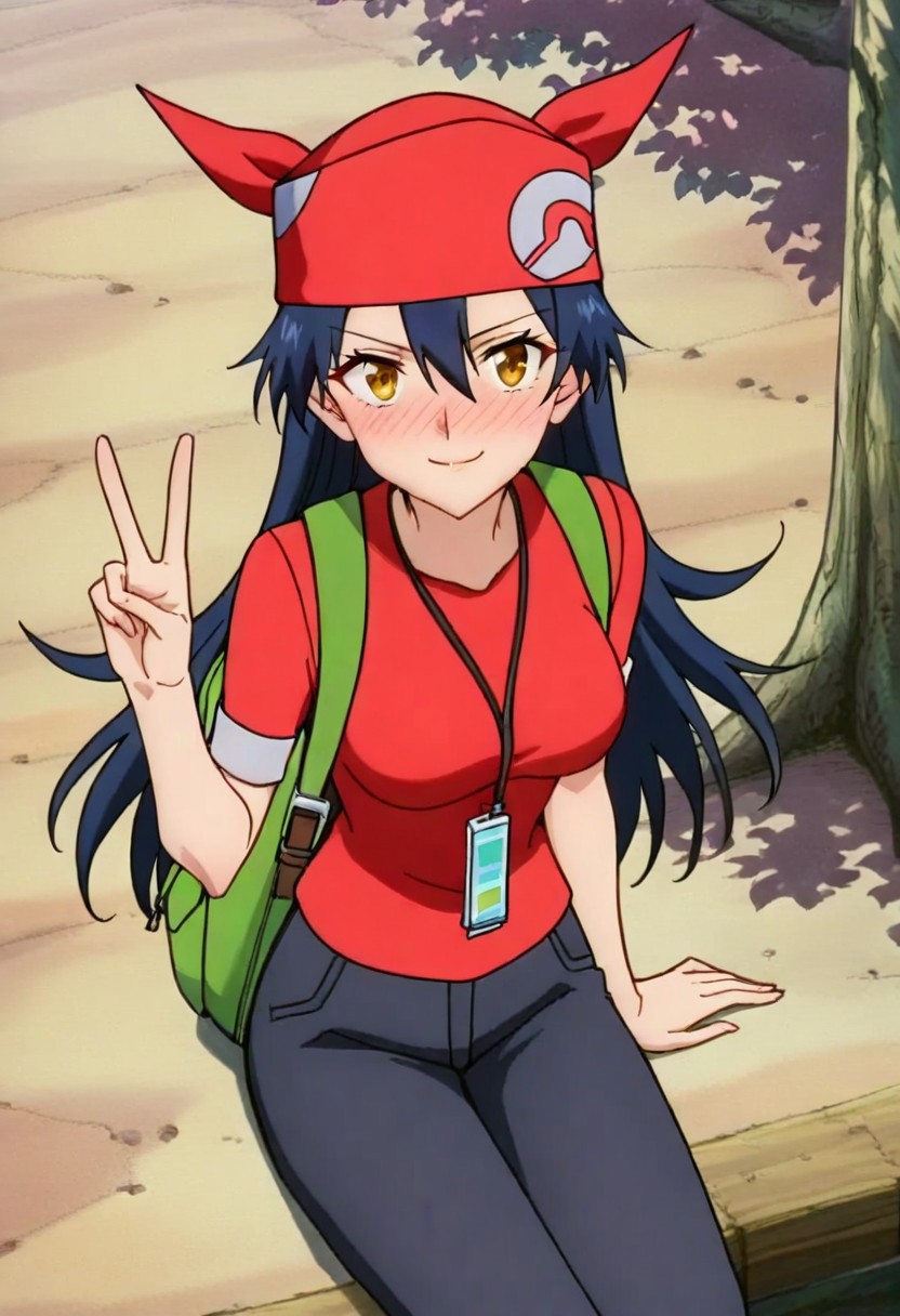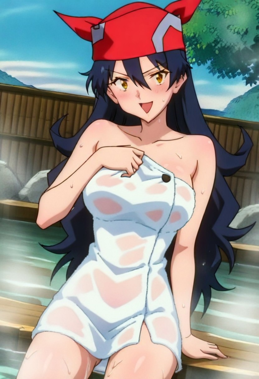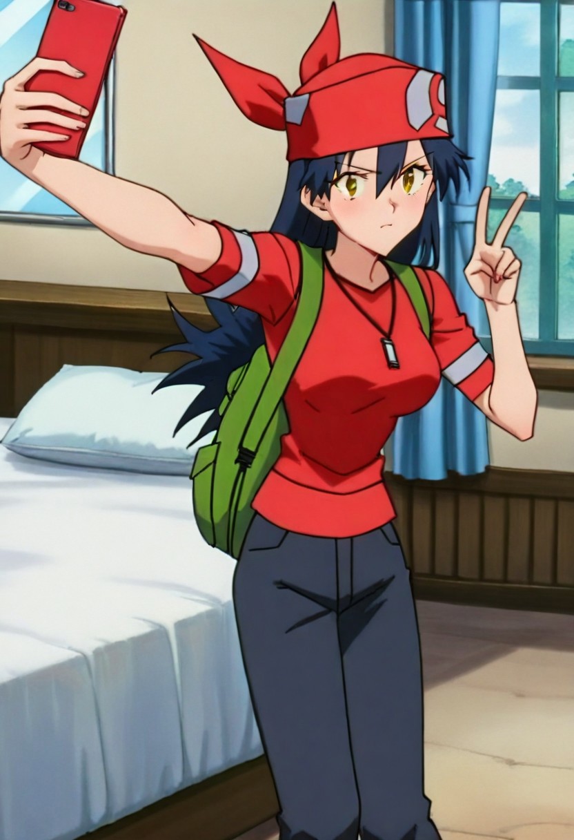 PKMNLisaM03, 1girl, long hair, black hair, bangs, hair between eyes, blue hair, red bandana, red headwear, yellow eyes, brown eyes, eyelashes