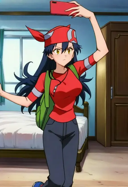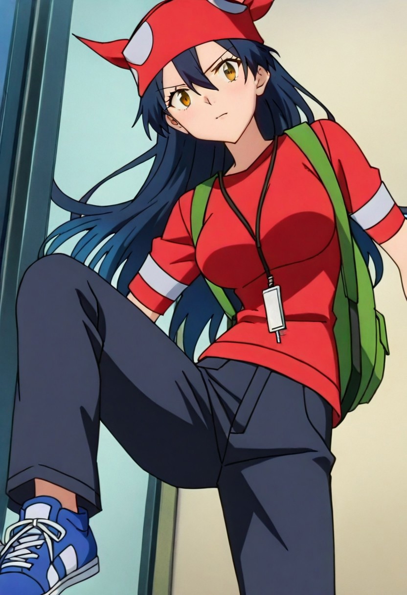 red shirt, short sleeves, green bag, backpack, breasts, black pants, pants