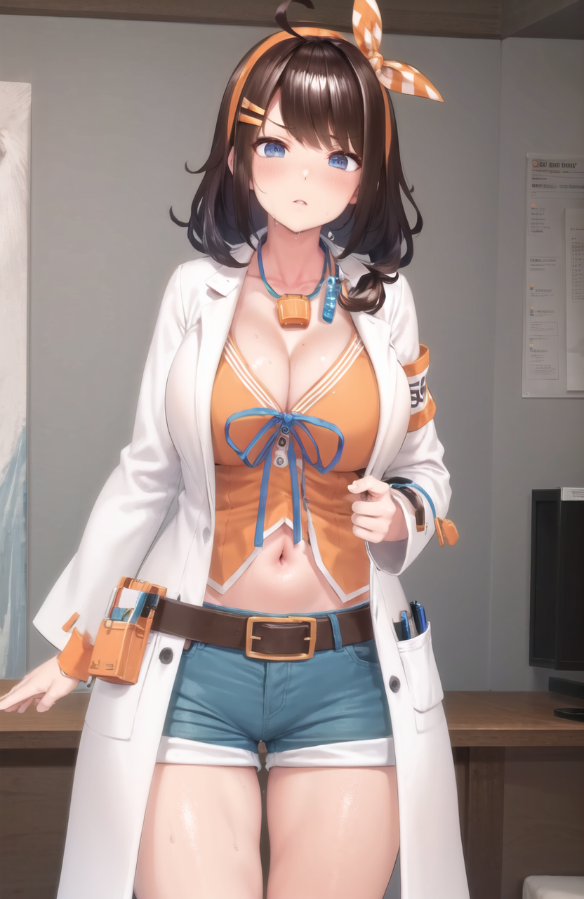 zutsuki tsukuru, blue eyes, collarbone, midriff, navel, goggles around neck, belt buckle, belt, orange bow, blue socks, bandana, hairclip, orange hairband, orange ribbon, armband, hair ribbon, ahoge, short hair, medium hair, black hair, hair ornament, brown hair, long sleeves, open clothes, open coat, white coat, labcoat, orange shirt, blue shorts, orange bowtie, vial, test tube, clothing cutout, orange footwear, sneakers, shoes,