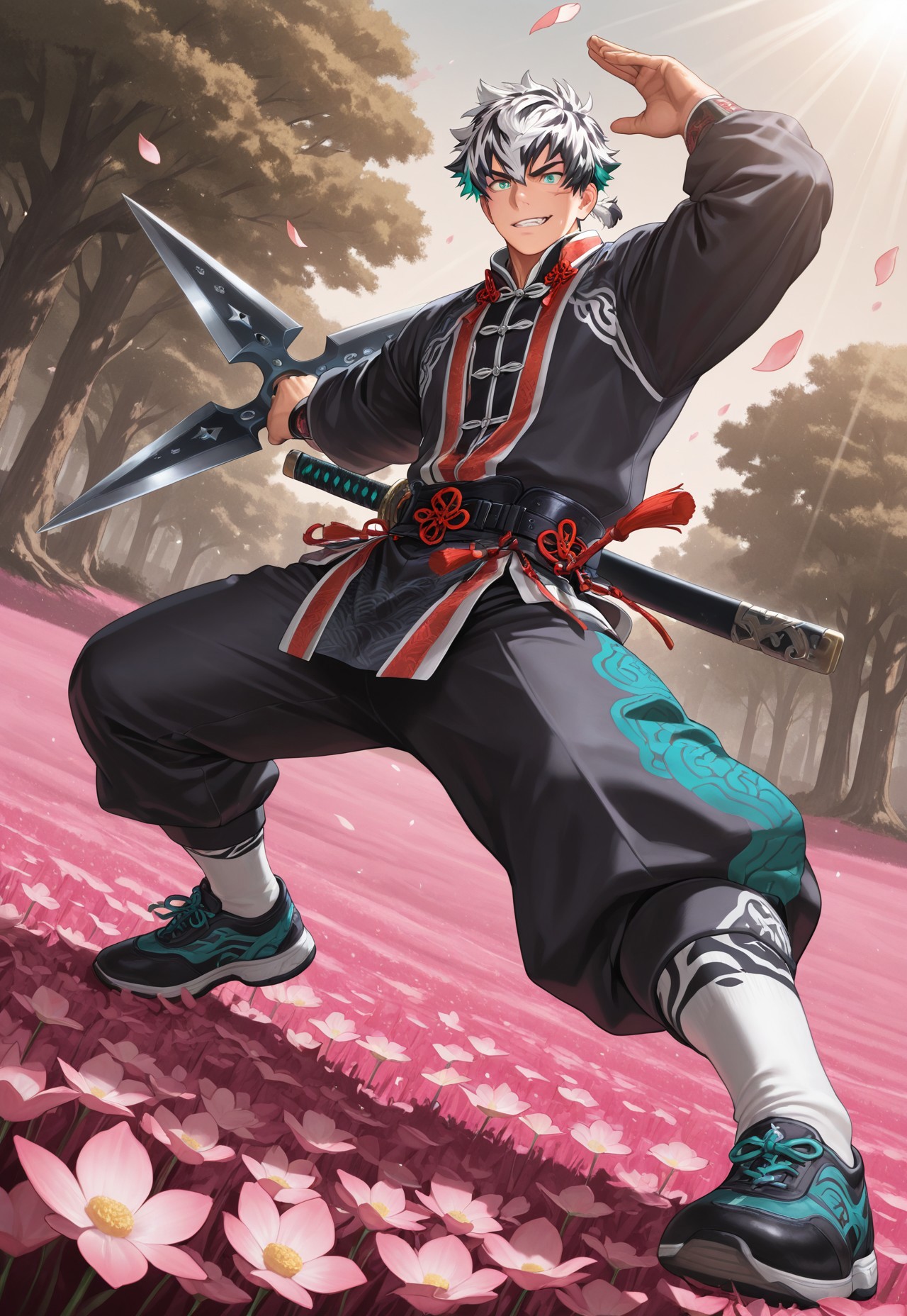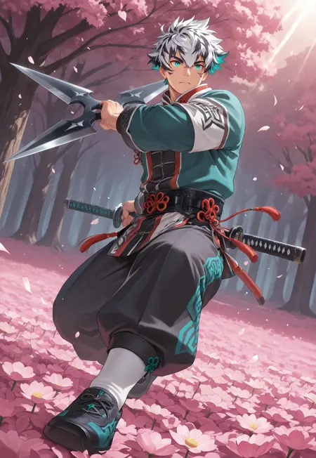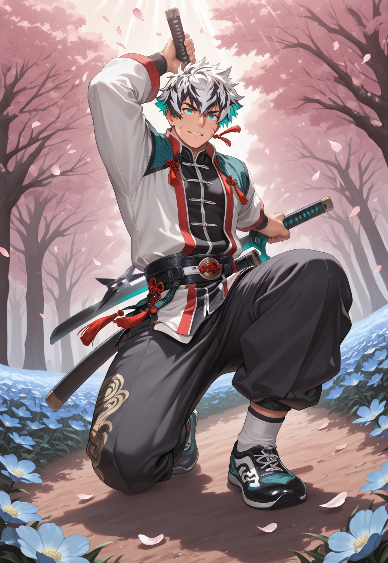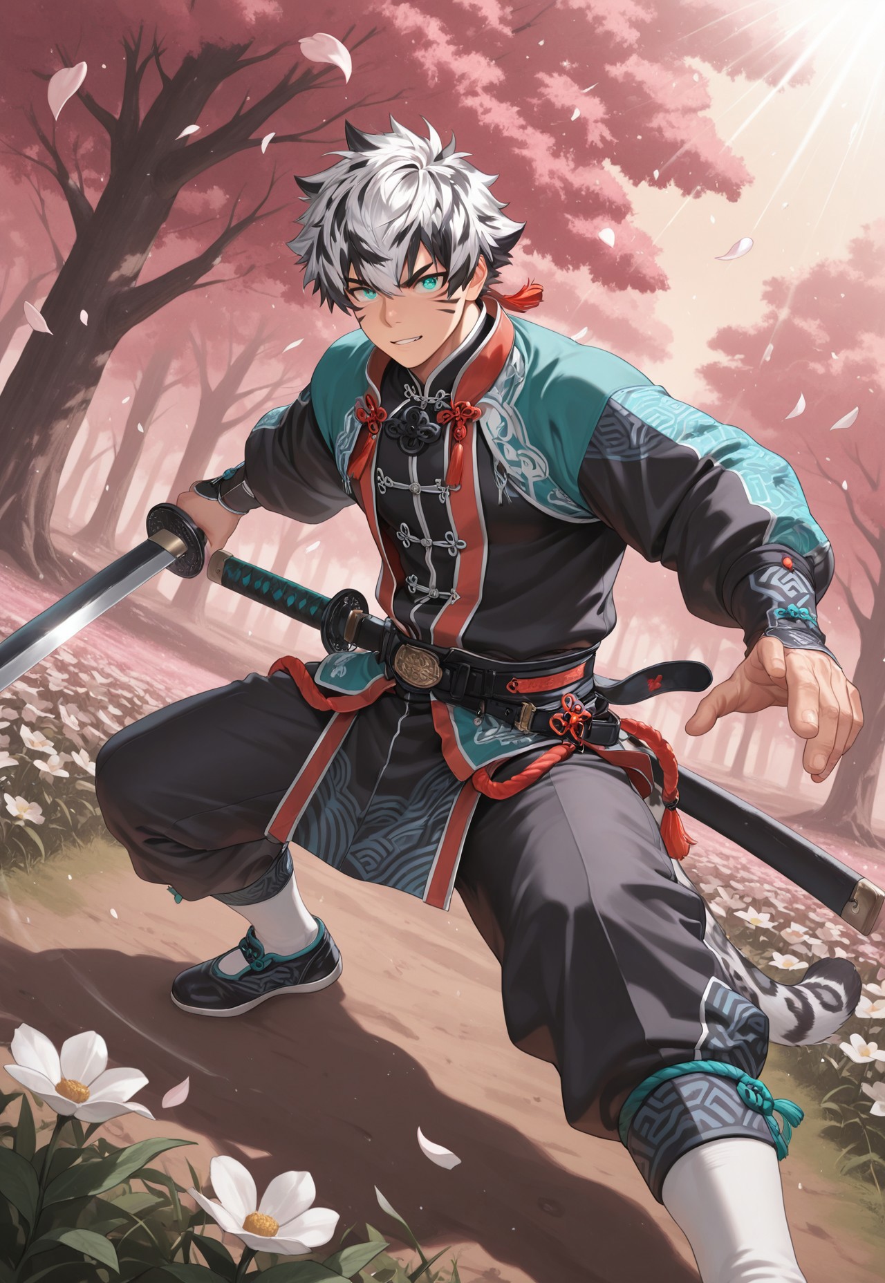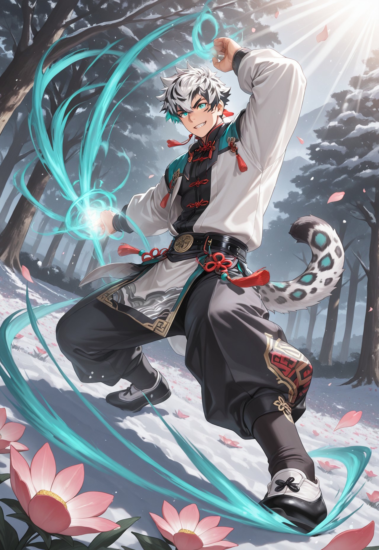 1boy, short hair, two-tone hair, teal eyes, tiger strapes,