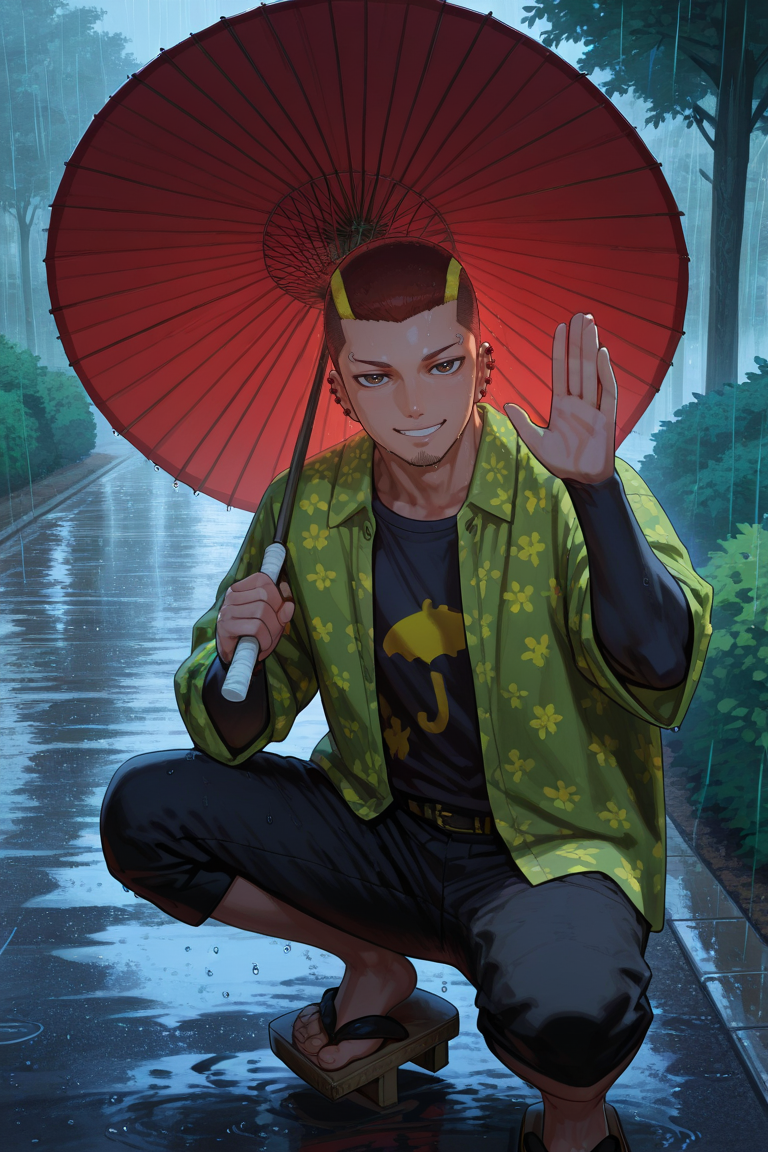 zuma_oversized_shirt_with_flower_patterns, tight longsleeves, zuma_knee_length_pants, geta sandals,