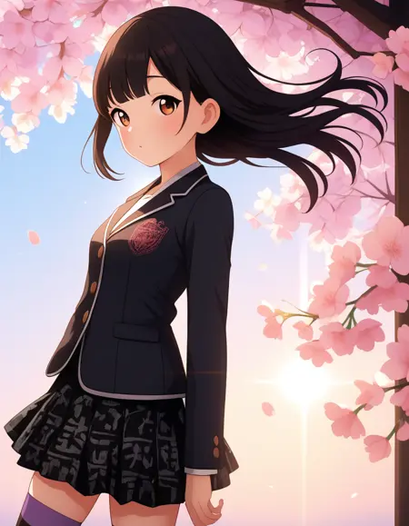 jacket,long sleeves,school uniform,black jacket,blazer,skirt,black skirt,thighhighs,purple thighhighs,shoes