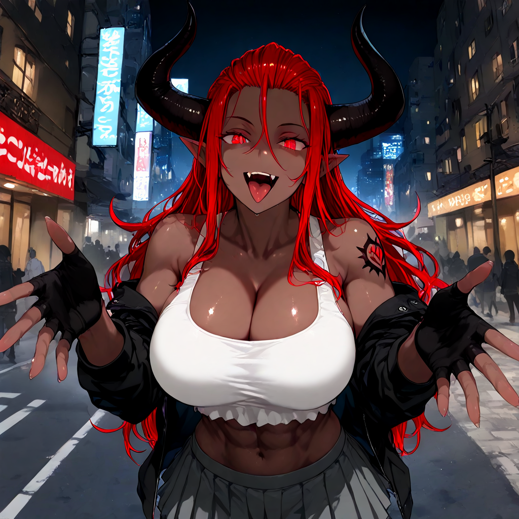 hyshrift, red hair, dark skin, small horns, dark-skinned female, black horns, facial mark, slit pupils, red eyes, pointy ears, white crop top, demon girl, short hair, off shoulder, shoulder tattoo, hair slicked back, grey skirt, black jacket, open jacket, sleeveless jacket, fingerless gloves, black boots, tall female, muscular female
