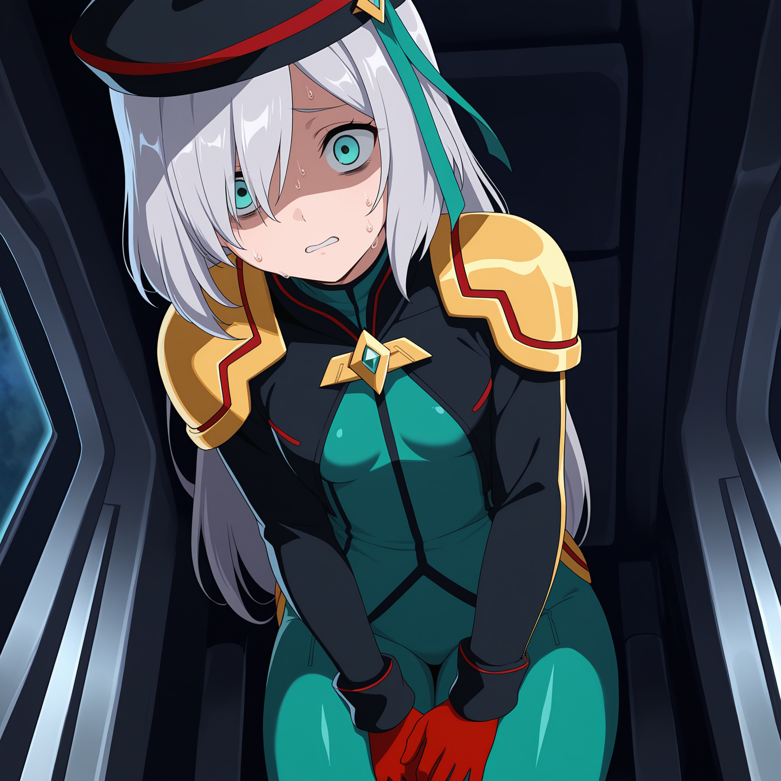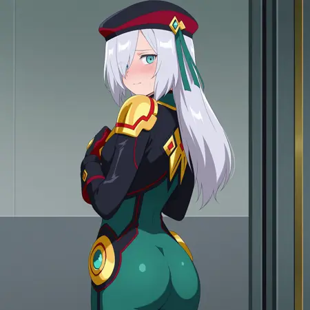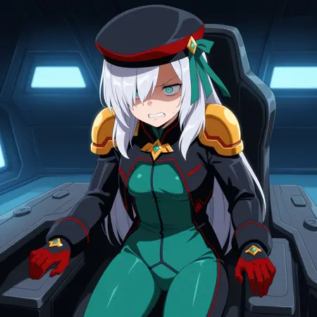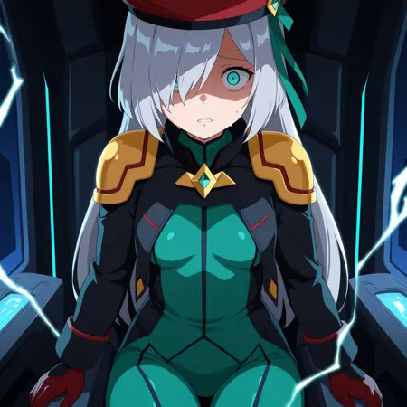 SthesiaAwarSesto, grey hair, long hair, sidelocks, hair over one eye, aqua eyes, small breasts, beret, black jacket, green bodysuit, golden shoulder pads, black gloves, red fingers,