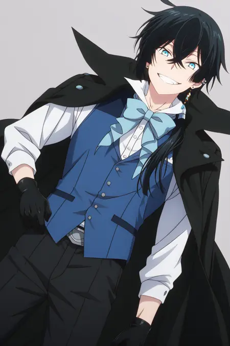 vanitas, vanitas_vnc, 검은 머리카락, 파란 눈, 눈 사이의 머리카락, 낮은 꼬리, 한쪽 귀 고리, 귀 piercing