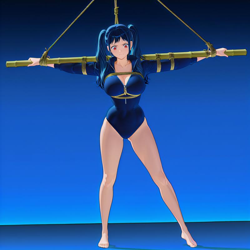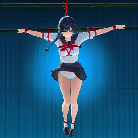 BambooYoke, shibari, red rope, black bamboo stick, bound, suspension, midair, suspension rope