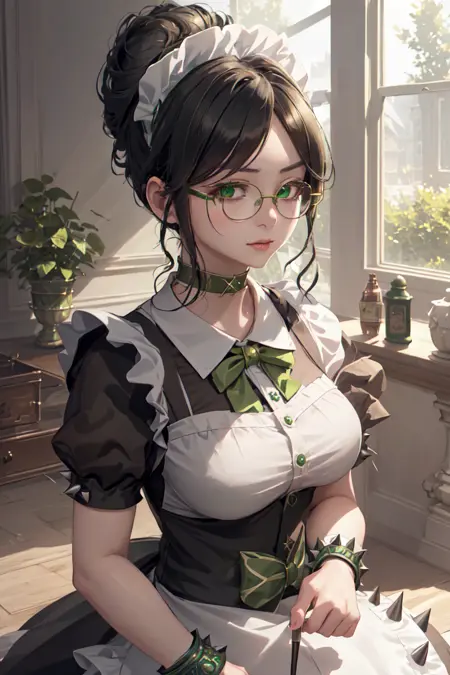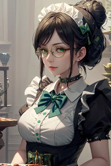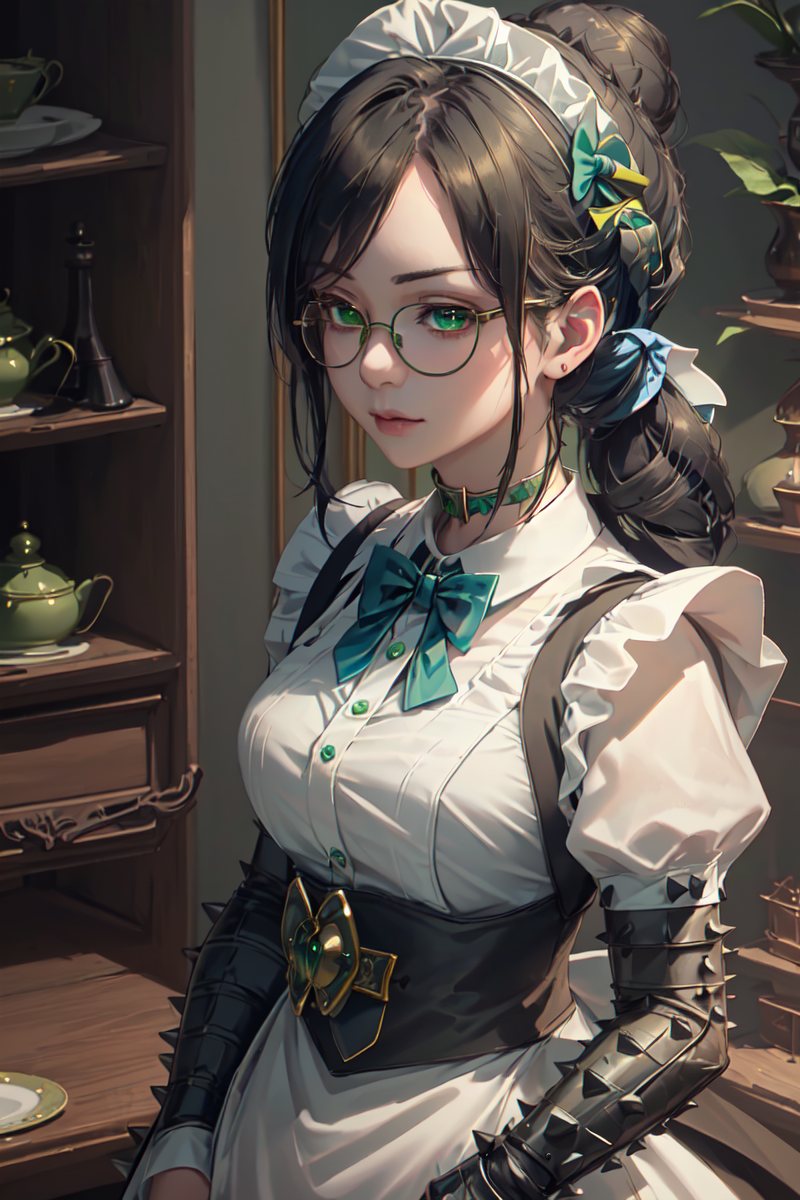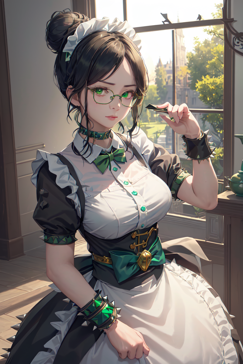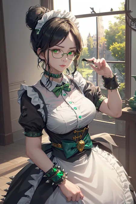 For better appearance add "black hair, (blue bowtie:1.3), (green wristband, green gauntlets, spikes:1.1), glasses, green eyes, maid, single hair bun, dress, choker, maid apron,"