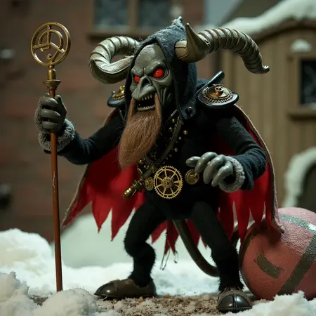r4nk1n8455 stop motion animation— スチームパンク風のクランプスが、悪い子・良い子のリストのアルゴリズムを調整中。石炭で動く息が-40°Fの空気中で見える。おもちゃの入った袋からはギアが漏れ出している。