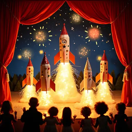 フェルトの毛皮、きらめく雪の山、トナカイ飾りで縁取られた雲、セロファンの川