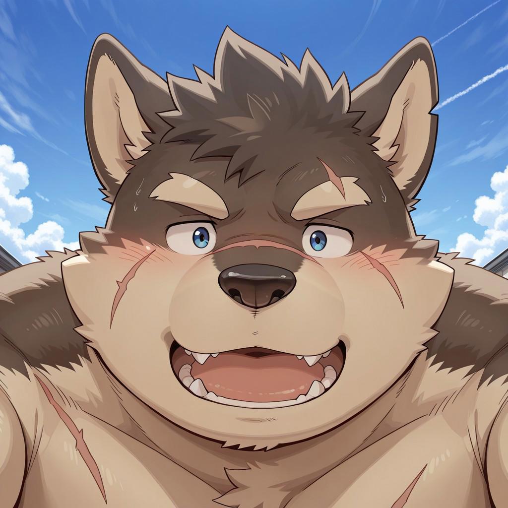 森隆,兽人,1个男孩,拟人化,雄性狗,男性焦点,肥胖,丰满,脸上有疤痕,浓眉,眉形切割,动物耳朵,疤痕,棕色毛发,尖牙,双色毛发