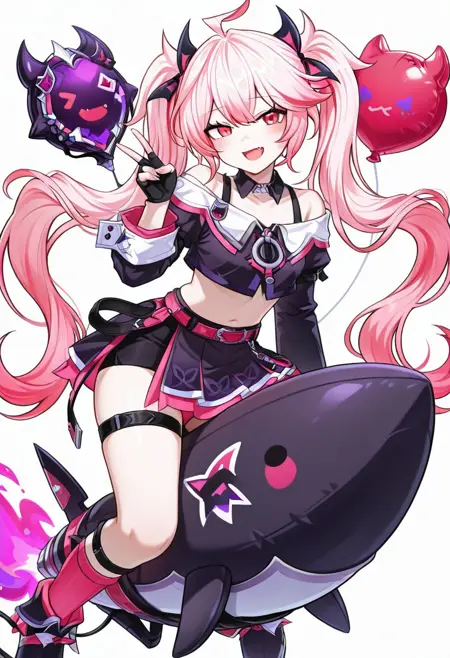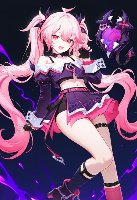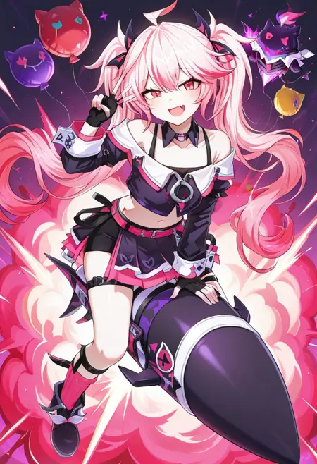 1人の少女、labypp、小さな胸、ピンクの髪、ストライプ髪、多色髪、ツインテール、labyppヘアリボン、非常に長い髪、赤い目、とがった耳、labypp鎖骨、黒いシャツ、アンダーシャツ、labyppシャツ、シャツ、オフショルダー、腹部、へそ、ベルト、レイヤードスカート、ミニスカート、ハーフスカート、labyppスカート、フィンガーレスグローブ、labyppグローブ、ショートパンツ、スカート下のショートパンツ、太ももストラップ、ハーフタイツ、足元の色違い、ピンクの靴下、ブーツ