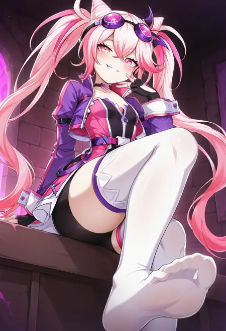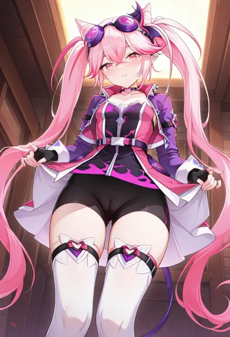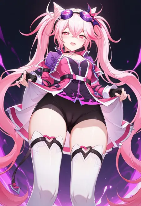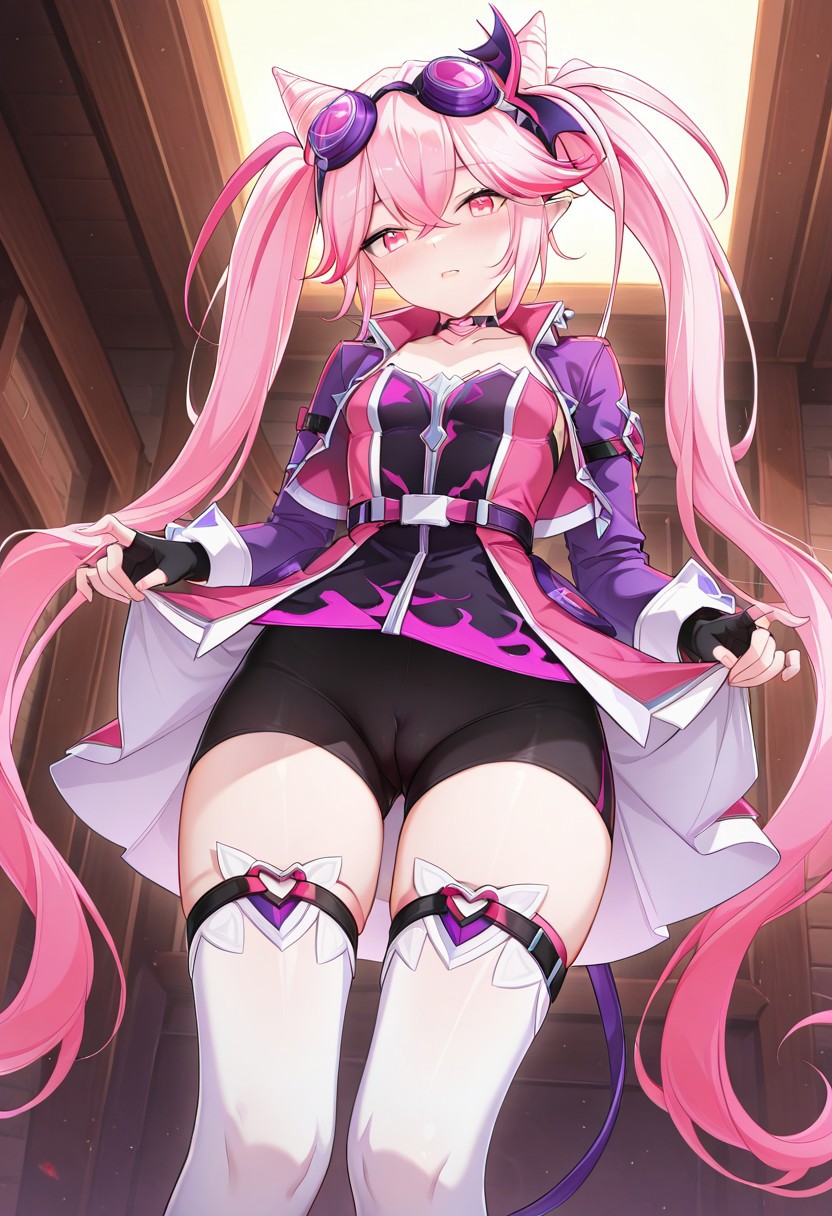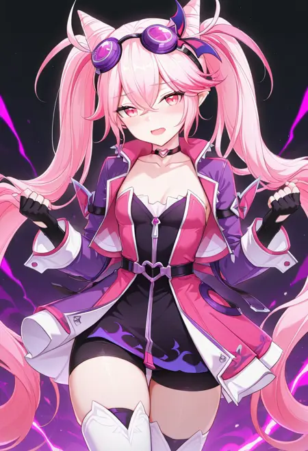 1人の少女、labytp、小さな胸、ピンクの髪、ストライプ髪、多色髪、ツインテール、非常に長い髪、ドリル髪、髪の結び目、コーン型髪の結び目、髪の装飾、ゴーグル、とがった耳、ピンクの目、Oリングチョーカー、ハートリングチョーカー、labytpジャケット、パープルジャケット、ピンクジャケット、フィンガーレスグローブ、labytpグローブ、labytpドレス、labytpベルト、バイクショーツ、labytpタイツ、白いタイツ、labytpシューズ