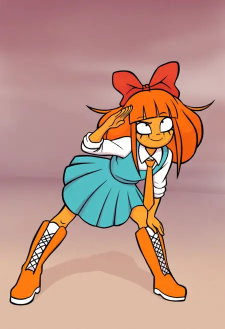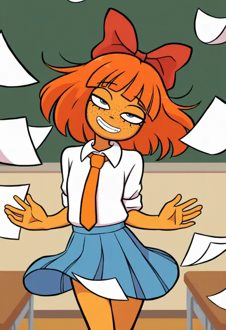 ZelligMymy, 주황색 머리 OR 검은 머리, 파란 치마, 흰 칼라 셔츠, 주황색 넥타이, 빨간 리본, 머리 리본, 두더지,