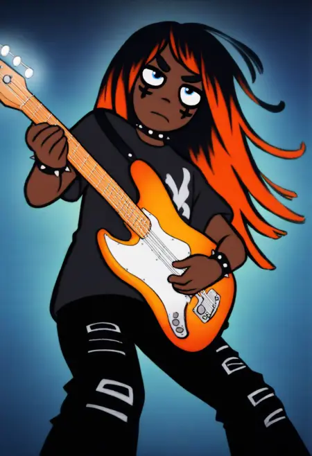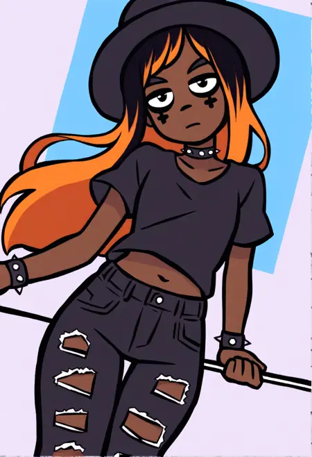 ZelligCleo, 검은 피부, 긴 머리, 곧은 머리, 다색 머리, 검은 머리, 주황색 머리, 검은 셔츠, 찢어진 바지, 검은 바지, 검은 모자,