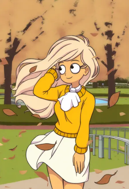 ZelligCoco, 긴 머리, 노란 스웨터, 흰 치마, 흰 애스콧, 팬티스타킹,