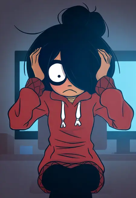 ZelligMaya, 한 줄기 머리말, 한쪽 눈 위의 머리카락 OR 긴 머리, 어지럽게 흐트러진 머리, 빨간 후디, 검은 팬티스타킹,