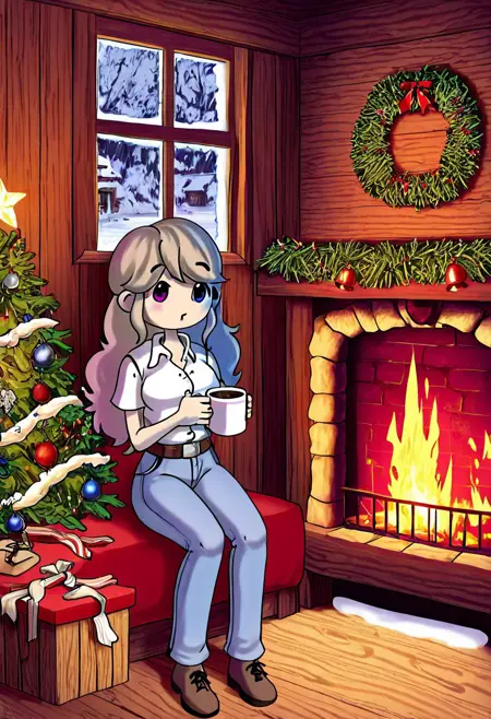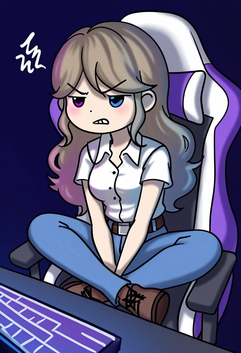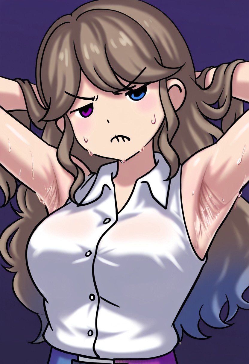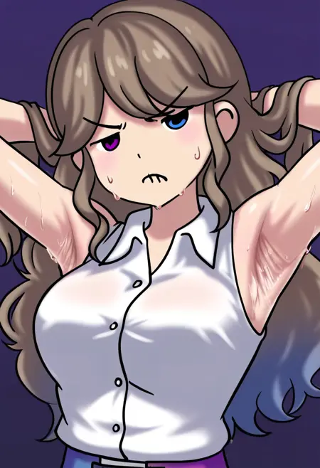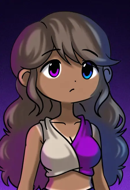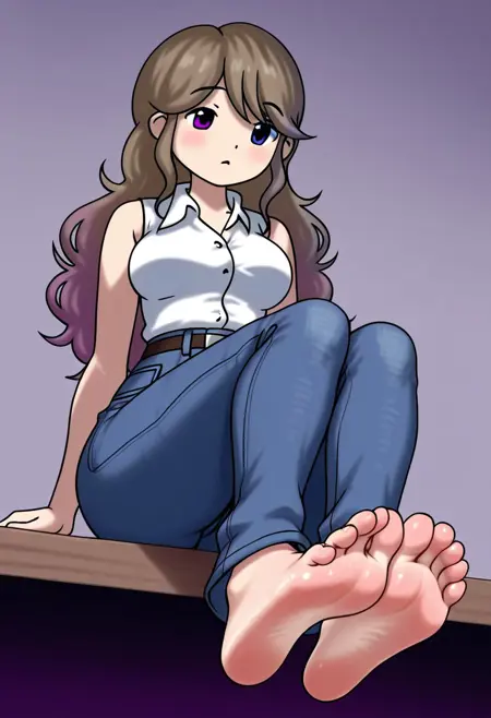 Alie, 1 girl, alone, long wavy brown hair with bangs with both strands on the sides, purple and blue eyes with heterochromia, white sleeveless button-down shirt, blue jeans with belt, brown shoes
