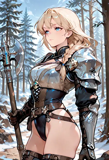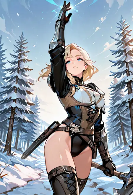 (score_9, score_8_up, score_7_up), masterpiece, best quality, very aesthetic, 8k, high resolution, superb quality, absurdres, (colorfull), (detailed:1.4), Smooth Quality, BREAK, big breast, 1girl, ((mature female)), adult, eyebrows, long hair, tanned, slim body, usnr, detailed, sexy, blue eyes, blonde hair, braided hair, side braid, determined expression, fantasy, white shirt , silver armor, black sleves, shoulder armor, gauntlets, black undershirt, brown corset, belt, pouches, ((thigh-high boots)), (Laced bodice), Metal knee guard, leather boots, buckles, criss-cross buckle at the waist, holding axe, large axe, detailed axe, dragon_princess