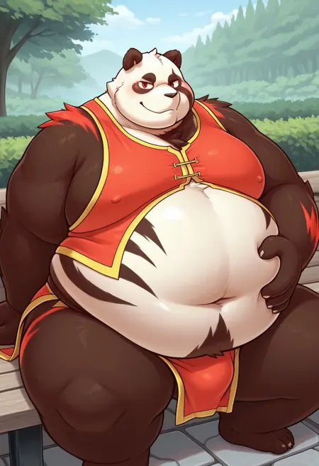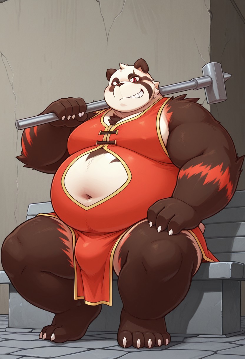 panda,Special eye circles,Black ears,Red Eyes,Black and white stripes on body,Limbs red and black fur,Red training suit,Iron rod