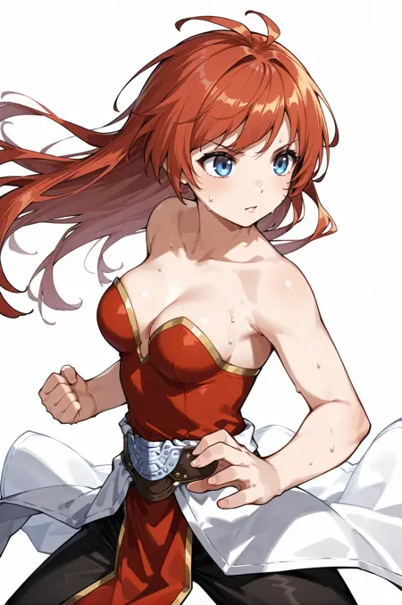 프롬프트: champRO, 보석, 흰색 민소매 코트, 빨간 스트랩리스 드레스, 검은색 바지, 골반 커튼, 검은 장갑, 빨간 팔보호대, 의상 컷아웃, 벨트, 후드, 부츠