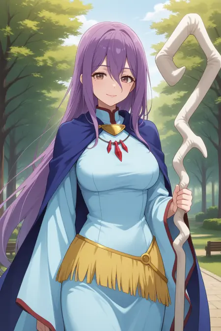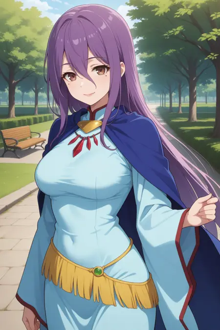 aacelestine, 갈색 눈, 눈 밑 모반, 보라색 머리, celestinedef, 목걸이, 파란색 드레스, 칼라가 있는 드레스, 노란색 벨트, 파란색 망토, 넓은 소매, 긴 소매,