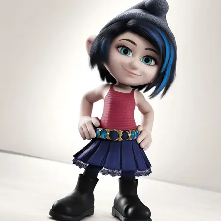 1girl, solo, 3d, vexy, gray skin, short black hair with a blue streak gray beanie, a sleeveless top, a dark blue skirt with a decorative belt, and black boots
