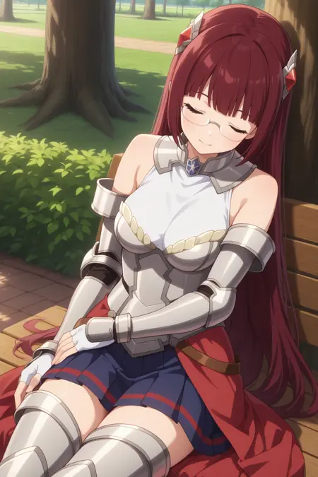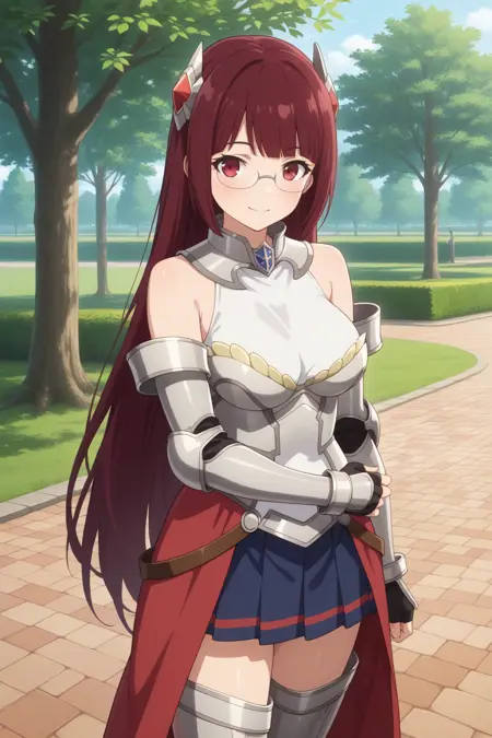 aaalicia, 빨간 눈, 안경, 빨간 머리, aliciadef, 머리 장식, 갑옷, 가슴판, 드러난 어깨, 팔꿈치 장갑, 손가락 없는 장갑, 허리 망토, 빨간 망토, 파란 치마, 주름 치마, 허벅지 부츠, 갑옷 부츠,