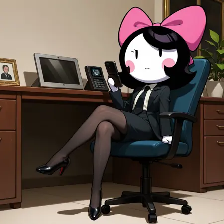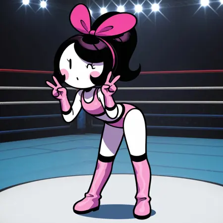 Tags (Girl): female, white body, white skin, short hair, black hair, pink bow on head, blush stickers, black eyes, eyelash, no sclera, pink dress, sleeveless,